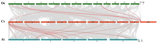 All 15 CsSBP genes were located on the corresponding chromosomes of sweet orange using chromosomal locations information extracted from C. sinensis Genome Annotation Project with Toolkit for Biologists software []. Gene densities were drawn according to the genome annotation information. Multiple Collinearity Scan Toolkit X (MCScanX) was adopted to exhibit potential gene duplication events. The synteny relationship of the orthologous SBP genes between sweet orange, rice, and Arabidopsis were identified using Synteny visualization plugin embedded in TBtools.