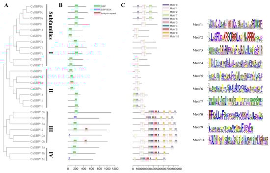 Phylogenetic relationships and protein structure of sweet orange CsSBP protein. (A) Neighbor joining trees constructed for CsSBP. (B) Conserved domains. Different domains are represented in different colors. (C) Protein motif. Schematic diagram of the conserved motifs of SBP proteins in sweet orange, which were elucidated using MEME. Each motif is represented by a number in the colored box. Logo of each motif is on the right side of the figure.