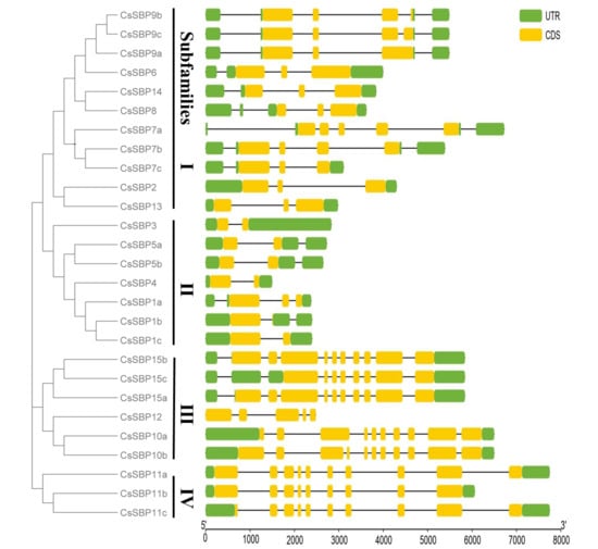 In order to investigate the evolutionary relationships of the SBP family, a NJ phylogenetic tree was constructed of the aligned amino acid sequences from C. sinensis (15 SBP), Arabidopsis thaliana (17 SBP), and Oryza sativa (19 SBP; Table S2). As evident from the phylogenetic tree, the SBP family can be grouped into four subfamilies (I–IV; Figure 1). Subfamily I with seven members was the highest and subfamily II and III contained four and three members, respectively, whereas subfamily IV possessed only one member (CsSBP11), a similar grouping pattern occurred in Chinese jujube [], suggesting independent evolution may have happened on CsSBP11.