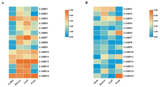Heatmap showing the expression of CsSBP genes in different tissues. (A) Gene expression in the RNA-seq Data. (B) qRT-PCR analysis of CsSBP genes expression in different tissues. The log2 fold change values were used to generate heat maps. Color gradient from orange to blue indicates that expression values change from high to low.