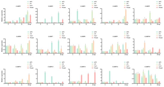 Expression levels of CsSBP genes under abiotic stress treatment. The Y-axis indicates the relative expression level; X-axis (0, 12, 24, and 48 hpt) indicates hours post abiotic stress treatment. Different colors represent different stress treatments. The standard errors are plotted using vertical lines. The experiments in all panels were repeated three times with similar results.