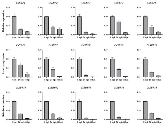 Expression levels of CsSBP genes inoculated with Diaporthe citri. The Y-axis indicates the relative expression level; X-axis (0, 24, and 48 hpi) indicated hours post D. citri inoculation. The standard errors are plotted using vertical lines. The experiments in all panels were repeated three times with similar results.