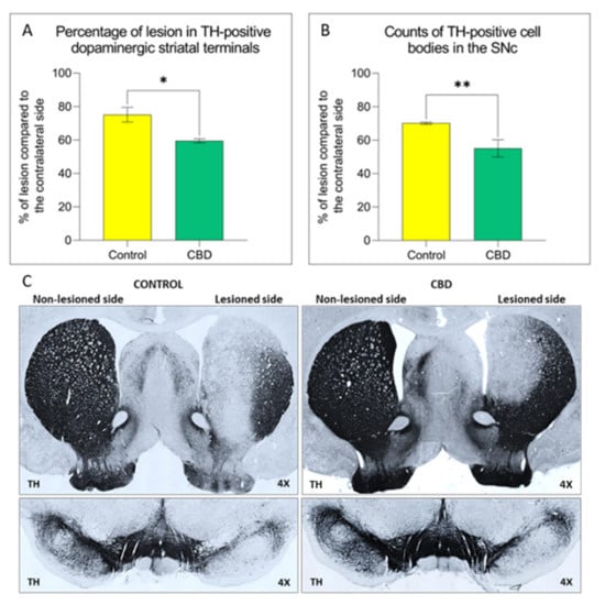 Effect of CBD treatment on the neurodegenerative process in the nigrostriatal pathway. The graphs show the percentage of lesion of (A) in the striatum. (B) in the SNc. (C) Representative images of the nigrostriatal damage in both experimental groups. Results are expressed as mean ± SEM. * p < 0.05 vs. control t = 2947, df = 12. ** p < 0.01 vs. control t = 3102, df = 13, Student’s t-test unpaired two-tailed. N = 6 to 8 in each group.