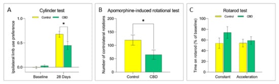 The potential effects of CBD treatment on PD progression were investigated by using the unilateral intrastriatal 6-OHDA-lesion model. The 6-OHDA injection in the striatum causes a partial and gradual degeneration of the nigrostriatal pathway, providing a therapeutic window (28 days) useful to evaluate the neuroprotective efficacy of new therapeutic strategies []. In this study, the 6-OHDA injection induced a 75% loss of dopaminergic striatal terminal and 70% loss of dopaminergic neurons in the SNc after 28 days (Figure 1). Animals treated with CBD showed a 21% significant reduction of the striatal terminal degeneration (Figure 1A; p = 0.012) and cell body loss in the SNc (Figure 1B; p = 0.008) in comparison with control group. CBD also ameliorated 6-OHDA-induced motor deficits as assessed by behavioral tests. Lesioned animals showed a prevalent use of the forepaw ipsilateral to the lesioned side over the contralateral, “parkinsonized” forepaw at cylinder test. Interestingly, animals treated with CBD displayed a significantly lower preference (34%; p = 0.032) in the use of the ipsilateral limb than control rats, indicative of a behavioral rescue (Figure 2A). Analogously the apomorphine-induced rotational behavior, a functional index of nigrostriatal lesion in 6-OHDA animal models, was significantly reduced (54%) (p = 0.044) in the animals treated with CBD (Figure 2B). Last, the rotarod test was performed to evaluate the motor coordination of rodents. While the analysis of baseline (pre-lesion) motor activity did not reveal any difficulty to stay in balance on the rotating bar in both experimental groups, after nigrostriatal lesion, animals exhibit a reduction (about 50%) in the motor performance as shown in the control group. CBD treatment did not ameliorate motor performance at this test (Figure 2C).