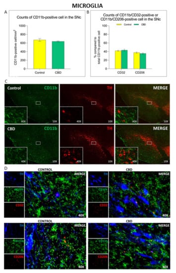 Immunomodulatory effect of chronic treatment with CBD on microglia activation and polarization in the SNc. Com-parison of (A) CD11b+ cell density and (B) microglia polarization state in the SNc in both experimental groups. (C,D) Representative images of the microglia activation and polarization in the SNc in both experimental groups. The results are expressed as mean ± SEM. N = 6 to 8 in each group.