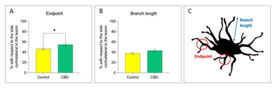 The 6-OHDA-induced neurodegenerative process is accompanied by a neuroinflammatory response in the SNc characterized by the increase in glial cells density (microglia and astrocytes) and a change towards a pro-inflammatory phenotype []. No differences in the number of CD11b+ cells/mm [] and in microglia cell polarization towards the cytotoxic M1 (CD11b+/CD32+) or cytoprotective M2 phenotype (CD11b+/CD206+) were observed in animals treated with CBD compared to controls, as shown in Figure 3. As we did not observe any effects on microglia density and phenotype, potential changes in microglia morphology after CBD treatment have been investigated. CBD-treated animals showed an 8% increase in the number of microglia endpoints (p = 0.010) (Figure 4A,C), accompanied by an increment in the length of microglia branches (Figure 4B,C), but the effect was not statistically significant (p = 0.082).
