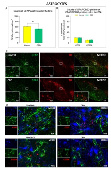 Immunomodulatory effect of chronic treatment with CBD on astrocytes activation and polarization in the SNc. (A) Comparison of GFAP+ cell density in the SNc in both experimental groups. (B) Comparison of astrocyte polarization in SNc in both experimental groups. (C,D) Representative images of the astrocyte activation and polarization in the SNc in both experimental groups. Results are expressed as mean ± SEM. * p < 0.05 vs. control t = 2937, df = 13, Student’s t-test unpaired two-tailed. N = 7 to 8 in each group.