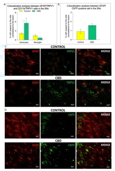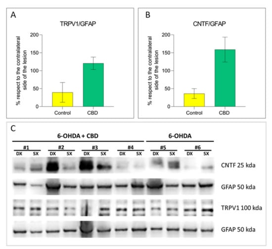 The aim of this study is to evaluate the effects of chronic treatment with CBD on neurodegenerative and neuroinflammatory processes, and motor deficits in a classic toxic model of PD based on unilateral intrastriatal injection of 6-hydroxydopamine (6-OHDA). The potential mechanisms by which CBD exerted its effects in this model have been also investigated. CBD-treated animals showed a reduction of nigrostriatal degeneration accompanied by a recovery of motor performance. In particular, CBD, by activating the astrocytic transient receptor potential vanilloid 1 (TRPV1) [], enhanced the endogenous neuroprotective response of ciliary neurotrophic factor (CNTF). Specifically, activation of TRPV1 on astrocytes increases endogenous CNTF synthesis in vivo, enhancing the viability of dopaminergic neurons through activation of the CNTF receptor alpha subunit (CNTFRα) and preventing neurodegeneration and inducing the recovery of motor performance after administration of MPP+ and 6-OHDA in PD rat models [,,,].
