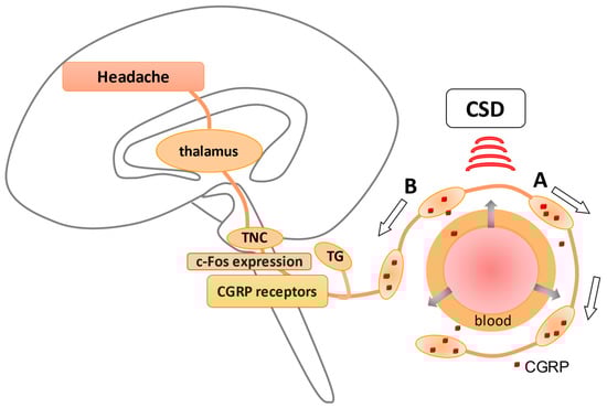 Cortical spreading depression (CSD), relevant to the development of migraine aura, has been shown to activate the trigemino–vascular system (TVS). Anti-temporal conduction of trigeminal ganglion neurons leads to the release of neuropeptides, including calcitonin gene-related peptide (CGRP), from their nerve terminals, leading to vasodilation and plasma extravasation. The dura is densely innervated by sensory nerve fibers that contain these neuropeptides originating from the trigeminal ganglion (TG), causing neurogenic inflammation in the dura (A). In contrast, direct conduction of TG neurons generates a pain sensation via the activation of c-fos in trigeminal nucleus caudalis (TNC) (B), which is eventually perceived as a headache. CGRP receptors are observed in TGs and TNCs but not in peripheral trigeminal nerve terminals, suggesting that CGRP receptor antagonists may suppress neurons in TGs and TNCs. An explanation of how CSD stimulates TVS is given in Figure 1.