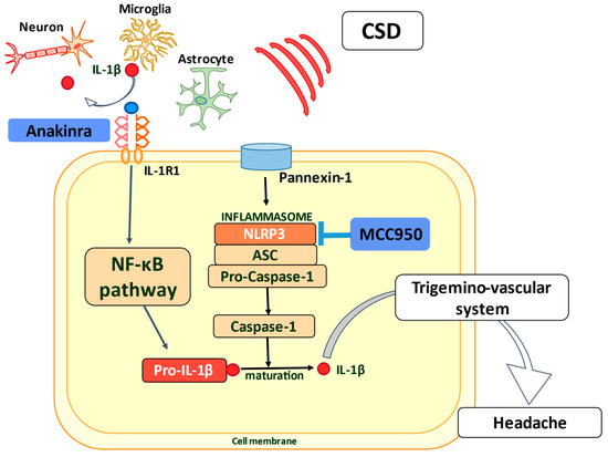 CSD can trigger Pannexin-1 megachannel opening and mediate the formation of the inflammasome, comprising apoptosis-associated speck-like protein (ASC), NLRP3, and pro-caspase-1, in neurons of the cortex area. Pro-caspase-1, released by the formation of inflammasomes, is activated to cleave and mature pro-IL-1β. Additionally, IL-1β induces a substantial neuroinflammatory signal that alerts adjacent cells and eventually reaches the trigeminal nervous system around the meningeal vessels, activating this nervous system and resulting in a headache. In the CNS, CSD can induce the production of IL-1β by neurons, astrocytes, and microglia. IL-1β binds to the type I IL-1 receptor and activates the transcription factor NF-κB, which promotes the production of pro-inflammatory cytokines and generates an inflammatory cascade. Anakinra antagonizes the effects of IL-1β by inhibiting IL-1R1, and MCC950 stimulates the blockade of these neuroinflammatory cascades by inhibiting NLRP3, which might suppress the headache.