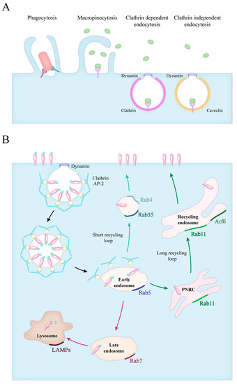 Forms of particle uptake and the endocytic routes. (A) The endocytic routes involve phagocytosis, macropinocytosis, clathrin mediated and clathrin independent endocytosis. (B) The fate of internalized particles is shown in the case of clathrin dependent endocytosis. Vesicles scissed from the plasma membrane quickly lose their clathrin coating and fuse with early endosomes (black arrows). Early endosomes transition into late endosomes, and in time, to lysosomes (red arrows). The recycling of receptors can occur via a short loop (green arrows), directly from early endosomes or through a long loop across the perinuclear recycling compartment (PNRC) and recycling endosomes (dark green arrows). The small GTPase Rab proteins characteristic for each stage are also indicated.