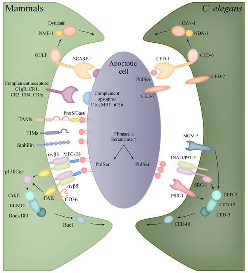 Phagocytosis of apoptotic corpses involves conserved pathways in the nematode (Table 2). The worm does not possess dedicated macrophages; instead, the neighbouring cells provide the phagocytic function. Similar to other organisms, the well-conserved PtdSer acts as the main signal of cell death or “eat-me” signal. The exposure of PtdSer in the worm during apoptosis is linked to the amino phospholipid translocase TAT-1 (Transbilayer Amphipath Transporter, ortholog of human flippase, ATPase phospholipid transporting 8A2, ATP8A2) and CED-8 (CEll Death abnormality 8, ortholog of human scramblase XKR8) function. In a living cell translocases actively transport PtdSer from the outer to the inner leaflet of the plasma membrane, but in an apoptotic cell, the inactivation of translocases and the activation of scramblases results in PtdSer accumulation on the cell surface [231]. After the recognition of an apoptotic cell, the activated receptors stimulate the extension of the engulfing cell’s membrane and the rearrangement of the actin cytoskeleton. Consequently, the phagocytic cell develops pseudopods around the dying cell. Just as the pseudopods fuse, the newly formed phagosome separates from the plasma membrane [232].