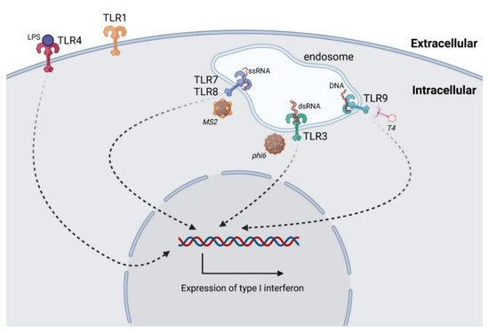 Intracellular interactions of bacteriophages with Toll-like receptors (TLRs). TLRs are capable of recognizing bacteriophage nucleic acids in endosomes (ssRNA (TLR7, TLR8), dsRNA (TLR3), and DNA (TLR9)). The scheme shows hypothetical interactions of bacteriophages with TLRs: bacteriophage MS2 (ssRNA), bacteriophage φ6 (dsRNA), and bacteriophage T4 (DNA). TLR4 can also be activated by LPS present in unpurified phage lysate. The activation of TLRs promotes the expression of type I IFNs.