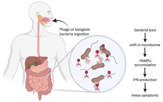 Bacteriophages are a part of the animal gastrointestinal microbiome [135]. They are thought to be responsible for shaping microbiome composition and bacterial diversity as well as facilitating horizontal gene transfer [135,136]. However, although phages mainly interact with bacteria, they also interact with eukaryotic cells of gastrointestinal tract (GIT) [136,137]. These interactions may be direct or indirect, when compounds released by lysed bacteria or phage proteins cause a reaction in the system [76,138]. Aside from naturally occurring phages, those introduced during phage therapy may occasionally occur in GIT. Oral phage therapy was proven to be effective in farming animals and humans [139,140]. Therefore, the influence those phages have on microbiome, as well as intestinal cells, has been a subject of intensive studies in order to determine if the use of oral phage therapy can be regarded as safe for patients [139,141].