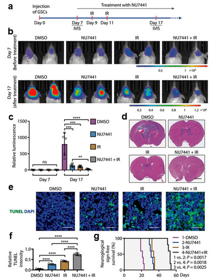 Inhibiting DNA-PKcs in combination with IR improved GB treatment. (a–c) In vivo bioluminescent imaging of orthotopic GB xenografts derived from H2S GICs expressing luciferase in immunocompromised NSG mice. Seven days after GIC transplantation, NSG mice were treated with DNA-PKcs inhibitor (NU7441) or DMSO (control) by intraperitoneal injection and/or irradiated (IR; 2 × 2 Gy) on day 9 after GIC transplantation. Representative images (b) of the four indicated treatment groups on day 7 (before treatment) and day 17 (after treatment) and quantifications (c) of tumor growth in mouse brains are shown. Data are means ± SD. n = 5 mice per group. ANOVA analysis was used to assess the significance. **, p < 0.01, ***, p < 0.001, and ****, p < 0.0001. (d) Representative images showing H&E staining of cross-sections of mouse brains bearing GIC-derived tumors from four groups of mice treated with NU7441, IR (irradiation), NU7441 + IR, or DMSO (control). Scale bar, 2 mm. (e,f) TUNEL assay detecting apoptosis (green) in the GB xenografts treated with the DNA-PKcs inhibitor NU7441, irradiation (IR), NU7441 + IR, or DMSO (control) and counterstained with DAPI (blue) to indicate nuclei (e). Quantifications of cell apoptosis from four treatment groups (f). Scale bars, 50 μm. ANOVA analysis was used to assess the significance. Data are means ± SD. n = 4 independent experiments (about 200 cells per arm). ****, p < 0.0001. (g) Kaplan–Meier survival curves of mice intracranially transplanted with H2S GSCs and treated with the DNA-PKcs inhibitor NU7441, irradiation (IR), NU7441 + IR, or DMSO (control). n = 5 animals per group. Log-rank analysis was used. Control versus NU7441, p = 0.0017; control versus IR, p = 0.0017; control versus NU7441 + IR, p = 0.0017; NU7441 versus NU7441 + IR, p = 0.0018; and IR versus NU7441 + IR, p = 0.0025 (modified after [67] with permission).