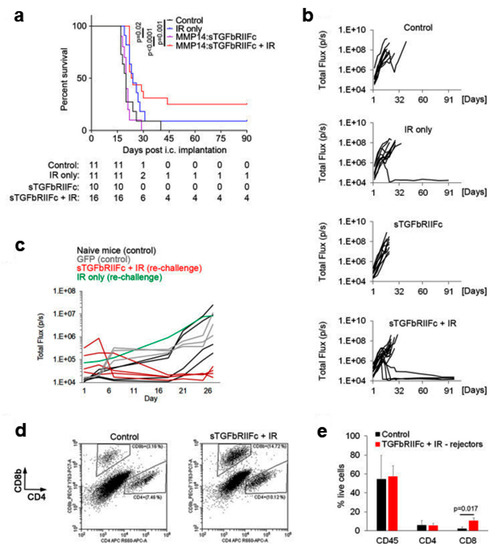 Mice were transplanted with HSC transduced with lentiviral vector expressing the soluble fusion protein of the TGFβ receptor II-Fc under regulation of the MMP14 promoter. This TGFβ inhibitory therapy was compared with tumor irradiation, the combination of the two therapies and control. The survival of the mice was monitored to assess the long-term benefits of the therapy. The combination therapy resulted in a significantly longer survival time with respect to the control group and TGFβ blocking monotherapy (Figure 2a). In addition, 25% of mice (four of 16) in the combination therapy group showed long-term survival with complete tumor rejection, compared with only one of 11 mice (9%) in the IR group and 0% in the remaining groups (Figure 2a,b). Ninety days after tumor rejection, the surviving mice were again subjected to intracranial implantation of GL261 cells. While the tumors grew again in the control mice and in the re-implanted mouse belonging to the IR group, the tumors failed to grow in all four of the re-implanted mice belonging to the combination therapy group (Figure 2c). Thus, in contrast to IR monotherapy, combination therapy resulted in long-term protection against tumor re-growth. Analysis of immune cells at the tumor implantation site 3 weeks after intracranial injection of the tumor cells revealed a significantly higher percentage of CD8+ T cells in the four mice in the combination therapy group that had rejected tumors for the second time as compared to the control represented by the mice in which there was tumor re-growth (Figure 2d,e). In contrast, infiltration by total CD45 + hematopoietic cells and CD4+ T cells was similar between the two groups (Figure 2d,e). This suggests that in addition to significantly reducing tumor recurrence and prolonging survival, TGFβ-blocking HSC therapy in combination with IR can provide long-term anticancer protection through the development of memory T cells. In summary, long-term protection from GB could be achieved only after the combined treatment (25% of mice) and was accompanied by a significant increase in CD8+ T cells at the tumor implantation site [68].