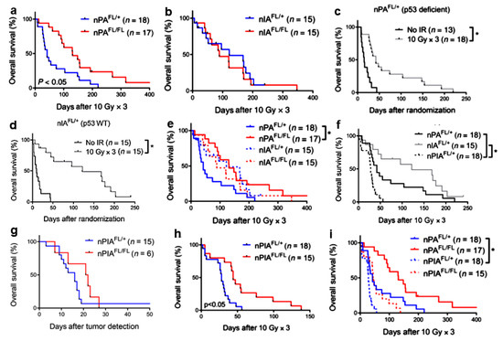 The Cre-loxP and replication-competent avian sarcomaleukosis virus long-terminal repeat with splice acceptor–tumor virus A (RCAS-TVA) technology was used to investigate whether the deficiency of the ataxia telangiectasia mutated (ATM) protein in mouse models of DIPG may allow increasing the sensitivity of the tumor to radiation (Figure 3) [69,70]. Primary brain stem gliomas with different genotypes were generated. Nestin-expressing, p53-deficient, ATM competent (nPAFL/+), and defective (nPAFL/FL) tumors were irradiated with three daily fractions to the brain, each of 10 Gy. The high radiosensitivity of glioma cells in nPAFL/FL mice resulted in a tripling of median survival after RT (Figure 3a, solid red line). These data confirm and extend previous preclinical studies showing that ATM targeting may represent a promising therapeutic approach to improve the HGG response to RT (reviewed in [71]). The deletion of Atm in Ink4a/Arf-deficient, p53 wild-type gliomas (nIAFL/FL) did not translate into improved survival after RT in vivo (Figure 3b, solid red line). Thus, the lack of functional ATM radiosensitized primary brain stem gliomas to RT in p53-deficient but not p53 wild-type tumors.
