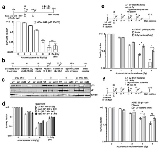 - Anbalagan, S.; Ström, C.; Downs, J.A.; Jeggo, P.A.; McBay, D.; Wilkins, A.; Rothkamm, K.; Harrington, K.J.; Yarnold, J.R.; Somaiah, N. TP53 Modulates Radiotherapy Fraction Size Sensitivity in Normal and Malignant Cells. Sci. Rep. 2021, 11, 7119. [Google Scholar] [CrossRef] [PubMed]