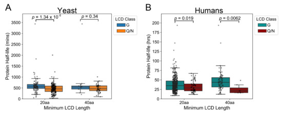 Despite the sensitivity of our model G-rich LCDs to degradation, a recent analysis of LCD-containing proteins showed that native yeast proteins with G-rich LCDs actually tend to have longer half-lives compared to non-G-rich proteins [32]. Additionally, despite the apparent resistance of Q/N-rich LCDs to degradation, native proteins with Q/N-rich LCDs tend to have shorter half-lives compared to non-Q/N-rich proteins [32]. However, the degree of G or Q/N enrichment in our model LCDs was not equivalent, and the relative difference between G-rich and Q/N-rich LCDs is not readily interpretable from these analyses. In order to make a direct comparison of G-rich and Q/N-rich proteins, we exhaustively scanned the yeast proteome for domains resembling our original model substrates, the hnRNP PrLDs [33,34] and the Sup35 nucleation domain (ND; a critical portion of the larger PrD [35]), with respect to both minimum size and minimum G or Q/N composition (see Materials and Methods). Indeed, proteins with G-rich LCDs tend to have longer half-lives than proteins with Q/N-rich LCDs in both yeast and humans when these two groups are compared directly (Figure 1 and Tables S1 and S2; see Materials and Methods for definition of G-rich and Q/N-rich LCDs; see Supplementary Materials). This observation and our previous data [31,36] imply that proteins with native Q/N-rich LCDs are not inherently more resistant to proteolysis than proteins with G-rich LCDs in vivo. Therefore, we hypothesized that secondary sequence features within native G-rich and Q/N-rich LCDs (i.e., non-G and non-Q/N residues, respectively) might influence the half-lives of their parent proteins.