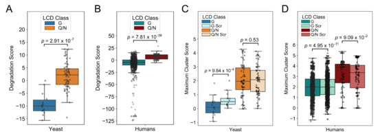 Degrons are often short linear motifs [39,40,41] with high degradation propensity, so clustering of degradation-promoting amino acids within G-rich and Q/N-rich LCDs may influence their potency. Furthermore, Q and N both exhibit low degradation propensity scores [31], so hydrophobic residues may be rendered incapable of inducing degradation when flanked by Q/N residues within Q/N-rich LCDs. To examine whether G-rich or Q/N-rich LCDs avoid clustering of residues with high degradation propensity, we repeatedly scrambled the original sequence of each domain and calculated the average maximum 8 aa score, excluding the primary amino acid(s) of interest (either G or Q/N; see Materials and Methods). Scrambled yeast G-rich LCDs have significantly higher cluster scores than native yeast G-rich LCDs (Figure 2C), suggesting that G-rich LCDs indeed selectively avoid clustering of degradation-promoting amino acids. However, little difference is observed between scrambled and native human G-rich LCDs (despite a statistically significant p-value; Figure 2D). Conversely, scrambled Q/N-rich LCDs have similar or slightly lower cluster scores than native Q/N-rich LCDs in yeast and humans (Figure 2C,D). Similar trends are observed with a shorter 4 aa cluster size (Figure S2). Collectively, these results suggest that selective pressures limit the overall degradation propensity scores as well as the clustering of degradation-inducing amino acids within eukaryotic G-rich LCDs, whereas Q/N-rich LCDs exhibit no discernible susceptibility to these pressures.