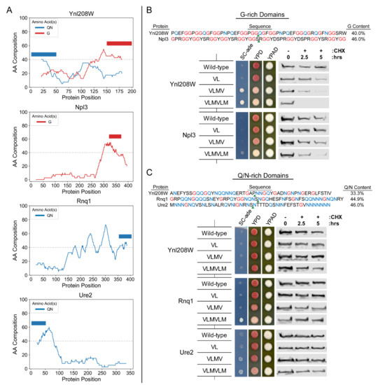 To generate composition plots (appearing Figure 3A), we developed a customizable Python script (CompositionPlotter) to visualize the local amino acid composition of an amino acid or group of amino acids for individual proteins. Selected proteins were scanned using a 40 aa window size for G and/or combined Q/N content. CompositionPlotter is available at (https://github.com/RossLabCSU/IJMS_2021, accessed on 19 April 2021).