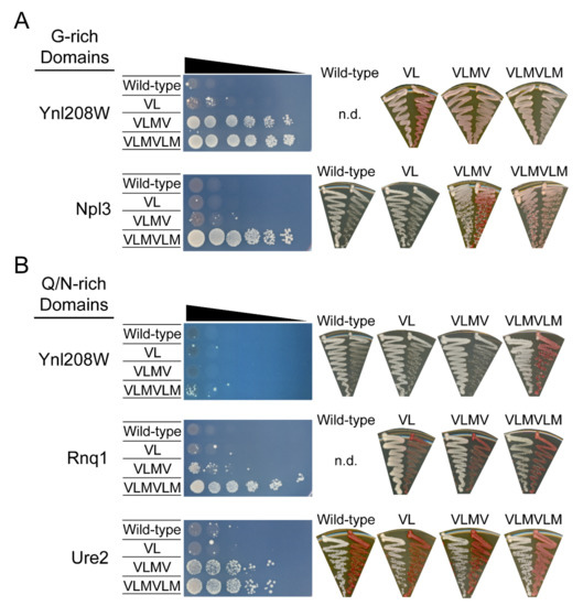 Prion propensity predictions for the G-rich and Q/N-rich LCDs fused to Sup35 were performed using the downloadable modified prion aggregation prediction algorithm (mPAPA) Python script (https://github.com/RossLabCSU/mPAPA, accessed on 26 April 2021; [21,24]). By default, mPAPA uses FoldIndex to identify intrinsically disordered regions and only evaluates disordered domains for prion propensity. All of our model LCDs are initially classified as disordered. In some cases, insertion of hydrophobic residues into our model LCDs resulted in re-classification from disordered to ordered: therefore, for consistency across mutants, LCD sequences were evaluated without a requirement that the domain is scored as disordered. For each fusion protein, the full LCD-Sup35 fusion sequence was used in the prediction. For simplicity of interpretation, mPAPA scores corresponding only to the LCD region are indicated in Figure S4.