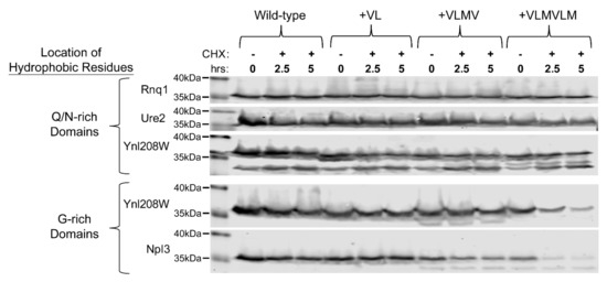 As predicted, insertion of hydrophobic residues within the Q/N-rich LCDs of Rnq1 and Ure2 did not enhance degradation of the full-length proteins (Figure 6), suggesting that these Q/N-rich LCDs are capable of masking the degradation-promoting effects of hydrophobic residues in their native contexts.