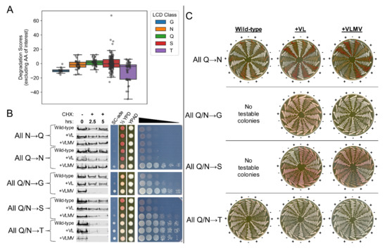 Figure 1 and Figure 2 collectively suggested that a selective pressure exerted on G-rich LCDs will tend to limit the number and clustering of hydrophobic residues, resulting in systematically lower degradation scores and higher protein half-lives. To explore whether this effect can be detected for any other polar LCD class independently (G, Q, N, S, or T), the yeast proteome was scanned separately for each class using LCD-Composer (window size = 40 aa, minimum composition threshold = 40%). Both Q-rich and N-rich LCDs exhibit higher degradation scores relative to G-rich LCDs (Figure 7A), suggesting that Q-rich and N-rich LCDs may independently suppress hydrophobic degrons. S-rich LCDs also exhibit high degradation scores, whereas a subset of T-rich LCDs exhibit extremely low degradation scores (Figure 7A), indicating that T-rich LCDs may also be susceptible to hydrophobic degrons.