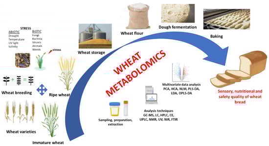 It is now well known that metabolomics can lead to finding solutions for high-quality food production and consumption. Recent studies have already indicated the potential of metabolomics for the “from the farm to the fork” concept due to its capacity to identify and quantify major chemical compounds as well as secondary metabolites. Metabolomics approaches via metabolite studies can establish a relation between wheat and environment, between the crop, soil and other ecosystem aspects. As a result, different correlations could be identified between the quality characteristics of bread (nutritional, organoleptic features) and the investigated metabolites [].