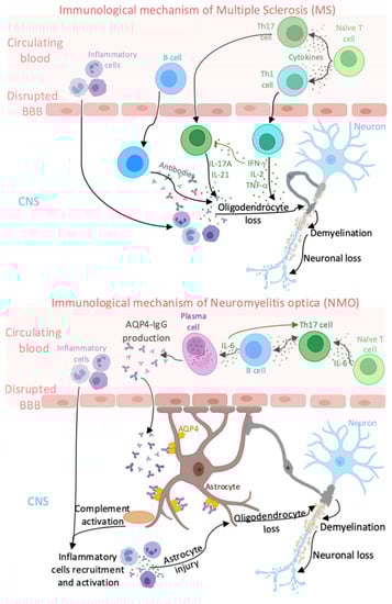 Immunological mechanism of MS and NMO. In MS: T helper (Th)-17 and Th1 cells differentiate from naïve T cells. The differentiation is stimulated by interleukin (IL)-1, IL-6, IL-12, IL-18, and IL-23. Th17 and Th1 cells alongside B cells infiltrate the central nervous system (CNS) at areas of increased blood–brain barrier (BBB) permeability. Herein, Th1 and Th17-related cells produce mainly pro-inflammatory cytokines which induce inflammatory cells infiltration. Immunopathogenesis driven by Th1 cells is strictly associated with Th17 cells, which are susceptible to the inhibition by IFN-γ. Moreover, B cells produce antibodies reactive against myelin antigens. Subsequently, inflammatory cells alongside cytokines and antibodies lead to oligodendrocyte loss, demyelination, and finally, neuronal loss. In NMO: Th17 cells differentiate from naïve T cells. The differentiation is stimulated by transforming growth factor (TGF)-β, IL-1β, IL-6, IL-7, IL-21, and IL-23. Th17 cells, inducing pro-inflammatory cytokines, including IL-6, interact with B cells, which stimulate plasma cells to produce aquaporin (AQP4)-4-IgGs. Besides, increased level of IL-6 associates with the tendency to release more IL-17A by Th17 cells and the proper differentiation of Th17 cells depends on IL-6 and IL-21 high level. AQP4-IgGs infiltrate into the CNS at areas of increased BBB permeability and then bind selectively to AQP4 on astrocytic endfeet. This binding induces the complement activation, which leads to the recruitment of peripheral inflammatory cells. Subsequently, inflammatory cell recruitment and activation alongside cytokines cause astrocyte injury, oligodendrocyte loss, demyelination, and finally, neuronal loss.