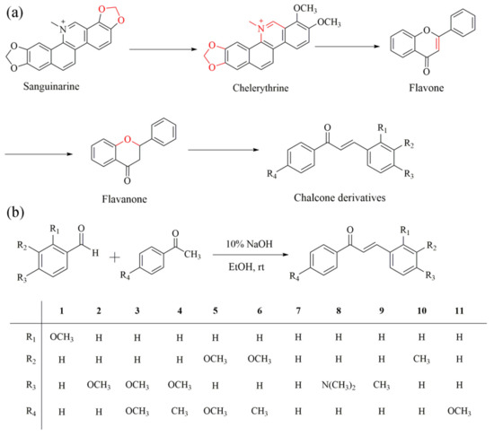 (a) Chemical structures of sanguinarine, chelerythrine, flavone, flavanone, and chalcone derivatives. (b) Synthesis route and chemical structure of chalcone derivatives 1–11.