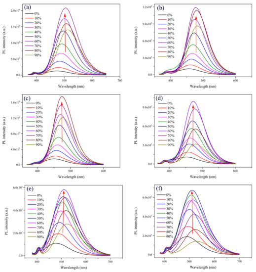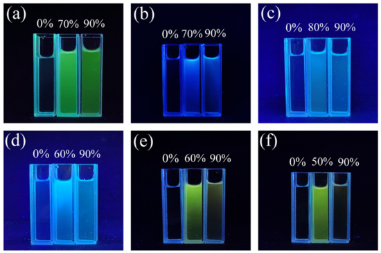 PL spectra of compounds (a) 1, (b) 2, (c) 3, (d) 4, (e) 5, (f) 6 in CH3OH/H2O mixed solutions (c = 2.07 × 10−5 M) with different water fractions (0–90%).