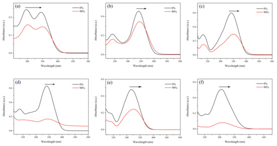 In order to further study the AIEE properties of compounds 1–6, the UV–vis absorption spectra of these compounds in the pure CH3OH solution and CH3OH/H2O mixed solution with 90% water contents were measured. The results are shown in Figure 3. In the pure CH3OH solution, the maximum absorption wavelengths of compounds 1–6 were 345, 341, 342, 341, 318, and 306 nm, respectively. As the water contents increased to 90%, the maximum absorption peaks of compounds 1, 2, 3, 5 showed a significant red shift, and the absorption peaks of compounds 4 and 6 disappeared, indicating that new aggregated particles formed in the solution with the increase in undesirable solvent (water) [40].
