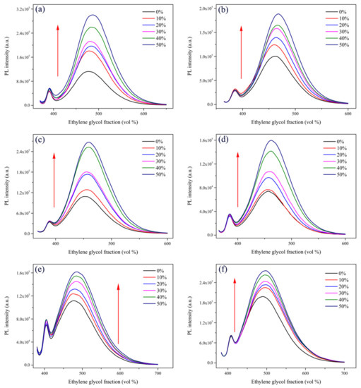 Fluorescence intensity of compounds (a) 1, (b) 2, (c) 3, (d) 4, (e) 5, and (f) 6 in CH3OH/EG mixed solutions with different EG fractions (0–50%).