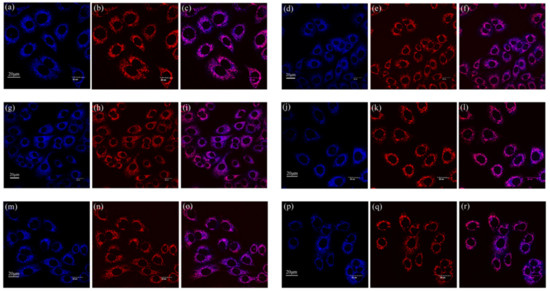 Co-localized images of A549 cells incubated with compounds (a) 1, (d) 2, (g) 3, (j) 4, (m) 5, and (p) 6 (10 µM) and Mito Tracker Red (200 nM) (b) 1, (e) 2, (h) 3, (k) 4, (n) 5, and (q) 6 for 30 min. The merged images co-cultured with (c) 1, (f) 2, (i) 3, (l) 4, (o) 5, (r) 6. The excitation wavelength of compounds 1–6 was 405 nm. The excitation wavelength of Mito Tracker Red was 578 nm.