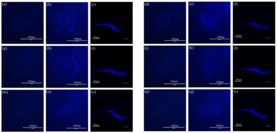 Fluorescence images of zebrafish embryos after soaking with compounds (a) 1, (d) 2, (g) 3, (j) 4, (m) 5, and (p) 6 (15 µM) for 1 h at 24 hpf. Fluorescence images of zebrafish embryos after soaking with compounds (b) 1, (e) 2, (h) 3, (k) 4, (n) 5, (q) 6 (15 µM) for 1 h at 48 hpf. Fluorescence images of zebrafish embryos after soaking with compounds (c) 1, (f) 2, (i) 3, (l) 4, (o) 5, (r) 6 (15 µM) for 1 h at 120 hpf.