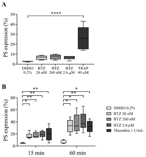 To determine whether BTZ induces PS exposure in platelets, we used drug concentrations that have been described as steady-state concentrations in BTZ-treated patients [34]. First, PS exposure in human platelet-rich plasma (PRP) pretreated with BTZ (26 nM, 260 nM and 2.6 µM) and thrombin receptor-activating peptide (TRAP) was investigated by flow cytometry. After 60 min of treatment, BTZ elicited a nonsignificant PS exposure in PRP, while significantly induced PS expression was observed in TRAP-stimulated platelets (p < 0.0001) (Figure 1A).