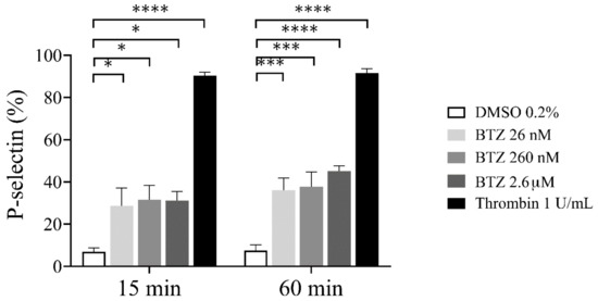 P-selectin expression in BTZ-preincubated human GFPs. GFPs were treated with BTZ, thrombin (positive control) and DMSO (negative control) for 15 and 60 min. P-selectin expression was analyzed by flow cytometry using anti-CD62P antibody. Mean ± SEM of 5 independent experiments is presented. The level of significance at both 15 and 60 min of treatment was determined using ANOVA and Dunnett’s multiple comparisons test; * p < 0.05, *** p < 0.001 and **** p < 0.0001 compared to the DMSO group. BTZ: bortezomib; DMSO: dimethyl sulfoxide.