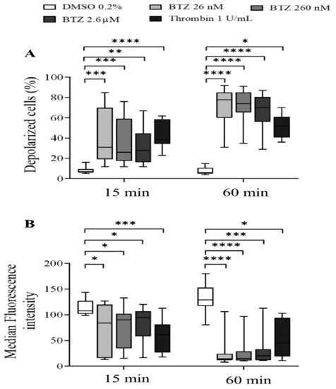 To characterize the effect of BTZ on the regulation of platelet lifespan, subsequently, the depolarization of the platelet mitochondrial inner membrane potential (ΔΨm) was evaluated. Human GFPs were treated with increasing BTZ concentrations and thrombin for the indicated times, and changes in the ΔΨm were monitored using the cationic, cell-penetrating dye 3,3′-dihexyloxacarbocyanine iodide ((DiOC6(3)). Depolarization of ΔΨm was quantified as an increase in the percentage of depolarized cells and a decrease in the fluorescence of DiOC6(3)-stained platelets. Representative dot plots of the percentage depolarized cells of one of twelve experiments are shown (Figure S2). The percentage of depolarized cells in thrombin-treated platelets was significantly higher at the specified times, as was that in all the BTZ samples (Figure 3A). The median fluorescence intensity (MFI) of depolarized cells, on the other hand, decreased accordingly (Figure 3B).