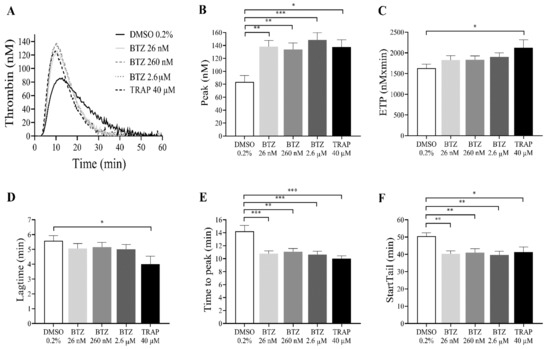 BTZ enhances in vitro thrombin formation in human GFPs. GFPs were treated with BTZ, TRAP (positive control) and DMSO (negative control) for 60 min and resuspended in autologous PPP to a final concentration of 20 × 109/L. Thrombin generation was initiated with 1 pM rTF (PRP reagent). Representative thrombin generation curves of 1 of 10 independent experiments are shown (A). Mean ± SEM of 5 experiments for TRAP or 10 experiments for DMSO and BTZ is presented (B–F). The level of significance was determined using ANOVA and Dunnett’s multiple comparisons test; * p < 0.05, ** p < 0.01, and *** p < 0.001 compared to the DMSO group. BTZ: bortezomib; ETP: endogenous thrombin potential; DMSO: dimethyl sulfoxide; TRAP: thrombin receptor-activating peptide.