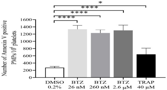 Detection of PMPs in BTZ-pretreated human GFPs. GFPs were treated with BTZ, TRAP (positive control) and DMSO (negative control) for 60 min. PMPs were analyzed by flow cytometry. The PMP gate was set using size (0.3–1 µm) calibration beads (Megamix-Plus FSC). Mean ± SEM of 5 experiments for TRAP or 10 experiments for DMSO and BTZ is presented. The level of significance was determined using ANOVA and Dunnett’s multiple comparisons test; * p < 0.05 and **** p < 0.0001 compared to the DMSO group. BTZ: bortezomib; DMSO: dimethyl sulfoxide; PMPs: platelet-derived microparticles; TRAP: thrombin receptor-activating peptide.
