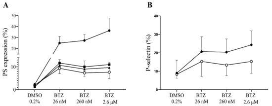 The proteasome inhibitor BTZ demonstrates antiproliferative and antitumor activities via inhibiting the proteasomal degradation of numerous regulatory proteins after ubiquitination. This drug has proven efficacy in several malignant hematological disorders, and it has primarily revolutionized the treatment of refractory and relapsed multiple myeloma. BTZ has demonstrated superiority to high-dose dexamethasone treatment, resulting in significantly more patients achieving complete or partial remission [39]. Subsequently, it was also approved for previously untreated patients with multiple myeloma or mantle cell lymphoma. BTZ acts in the bone marrow microenvironment by inhibiting the binding of myeloma cells to the stromal cells. This may be achieved since malignant plasma cells are more dependent on proteasomal activity likely because of the higher protein turnover and thus being more sensitive to its blockage [40]. It is also suspected that aside from the main site of action, BTZ exerts an effect on several other cell types. In preliminary experiments, we verified the apoptosis-inducing effect of BTZ on magnetically isolated peripheral blood B-cells of a healthy donor. In line with the results of a previous study [41], an increase in PS exposure was observed in all BTZ-treated samples compared to the control sample (Figure S4).