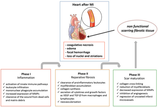 Healing of MI is a dynamic process that can be schematically divided into three phases: inflammation following necrosis, reparative fibrosis, and scar maturation (Figure 1). When ischemia is of sufficient duration, the myocardium undergoes coagulative necrosis with edema, focal hemorrhage, loss of nuclei and striations, and granulocyte infiltration in the first days following myocardial ischemia. Consequentially, mononuclear phagocytes accumulate in the infarcted area with the task of clearing it of dead cells and matrix debris [4]. Inflammatory cells and necrotic myocytes secrete and activate matrix metalloproteinases (MMPs), which degrade the matrix, helping macrophages in resorption of necrotic tissue. During a later phase (days 3 to 7), inflammation attenuates and a reparative phase follows. This phase is characterized by the stimulation of collagen synthesis due to the conversion of fibroblasts into myofibroblasts, production of vascular endothelial growth factor (VEGF) and TGF-β1, neovascularization of the granulation tissue, and scar formation. Eventually, the scar will mature through increased collagen cross-linking, myofibroblasts will undergo apoptosis and be removed, and the inflammatory response will resolve. Therefore, timely suppression and resolution of the post-MI inflammation are required to ensure optimal repair and to prevent alterations in chamber shape and ventricular function. Excessive early inflammation may enhance matrix degradation, favoring cardiac rupture and formation of ventricular aneurysms. On the other hand, a prolonged inflammatory response may impair collagen deposition during the reparative phase leading to the formation of a weaker scar, induce an additional loss of CMs in the surrounding non-infarcted myocardium, and provoke a ventricular chamber dilatation.