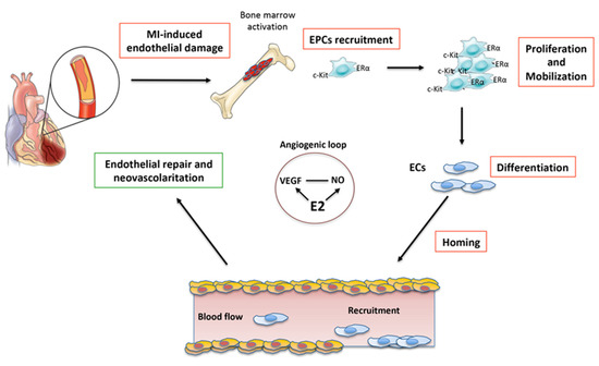 Some experimental studies carried out in animal models in recent years have highlighted not only the presence of endothelial progenitors (EPCs) in the bone marrow (BM) but also their mobilization towards the myocardium following damage. It has been shown that EPCs present in the infarcted myocardium, which come from the BM, are receptor tyrosine kinase protein (c-Kit)-positive and predominantly express ERα. Some studies suggest that these EPCs c-Kit+/ERα+ can improve cardiac function both in animals and humans in post-MI [63] due to their potential for self-renewal, proliferation, and differentiation following acute ischemic injury [64].