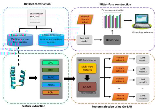 Motivated by these considerations, we present iBitter-Fuse, which is a novel computational model designed for accurate and large-scale identification of bitter peptides. The schematic framework of iBitter-Fuse for bitter peptide identification is depicted in Figure 1. Particularly, we explored a variety of feature encoding schemes (e.g., DPC, amino acid composition (AAC), pseudo amino acid composition (PAAC), amphiphilic pseudo amino acid composition (APAAC) and physicochemical properties from AAindex (AAI)) for providing sufficient information from different aspects (i.e., pertaining to compositional information and physicochemical properties) to build a more comprehensive prediction model. To enhance the predictive performance, the customized genetic algorithm utilizing self-assessment-report (GA-SAR) as introduced by Charoenkwan et al. [] was employed in identifying m informative features and the optimal ones are used as input to the support vector machine (SVM)-based classifier for development of the final model (iBitter-Fuse). Extensive comparative analysis indicated that the proposed iBitter-Fuse, which only utilizes m = 36 selected features, was able to achieve significantly better performance than those of conventional ML classifiers as evaluated by 10-fold cross-validation and independent tests. Moreover, iBitter-Fuse was shown to outperform existing state-of-the-art predictors in terms of ACC (0.930), Sn (0.938), Sp (0.922) and MCC (0.859) as evaluated on the independent test. Results highlighted that the proposed iBitter-Fuse has better generalization capability and discriminative power for accurately identifying bitter peptides than that of existing methods and conventional ML classifiers. Finally, the predictive model was deployed as the iBitter-Fuse web server and made freely available online at http://camt.pythonanywhere.com/iBitter-Fuse (accessed on 8 August 2021).