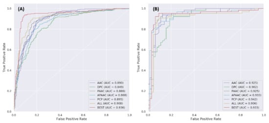ROC curves of different feature encodings based on 10-fold cross-validation (A) and independent tests (B).