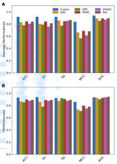 Performance evaluations of our fused features and the five individual feature descriptors based on (A) 10-fold cross-validation and (B) independent tests.