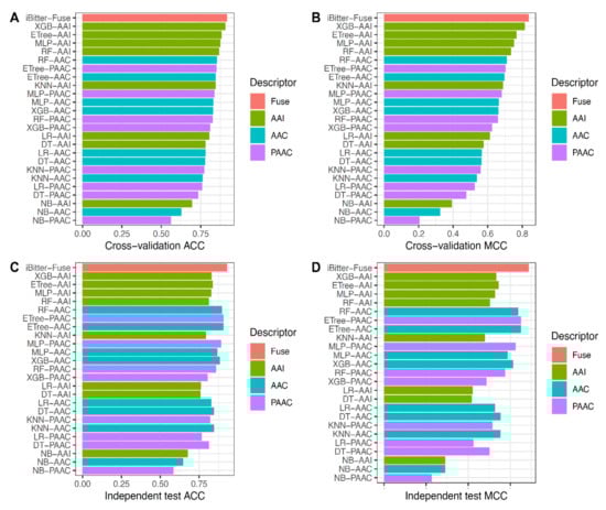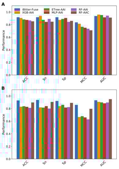 To evaluate the predictive performance of iBitter-Fuse, we compared its performance with those of conventional ML classifiers. Herein, we constructed and optimized several ML classifiers trained using decision tree (DT), extremely randomized trees (ETree), k-nearest neighbor (KNN), multi-layer perceptron (MLP), naive Bayes (NB), random forest (RF) and extreme gradient boosting (XGB) with three selected feature descriptors (AAC, AAI and PAAC). All of these ML classifiers were constructed and optimized using the scikit-learn Python machine-learning package (version 0.22) []. Herein, the optimal hyperparameters of respective ML classifiers were determined by using a grid search procedure and 10-fold cross-validation scheme (i.e., the search range is presented in Supplementary Table S1). To make a fair test, the same training and independent test datasets were used for model training and validation, respectively. Figure 4 and Supplementary Tables S4 and S5 display the details of 10-fold cross-validation and independent test results of iBitter-Fuse and several ML classifiers. Furthermore, Figure 5 and Table 5 show the performance comparison of our predictor with those of top five ML classifiers (XGB-AAI, ETree-AAI, MLP-AAI, RF-AAI and RF-AAC).