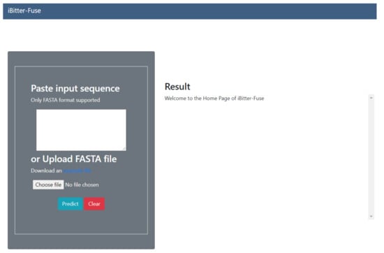 In order to allow easy access by the scientific community, we have developed a user-friendly web server iBitter-Fuse that is freely available online at http://camt.pythonanywhere.com/iBitter-Fuse (accessed on 8 August 2021). Herein, we provide step-by-step guidelines on how to use the iBitter-Fuse web server. Firstly, users can access the web server by entering the URL mentioned in the previous sentence, which would bring us to the webpage as shown in Figure 6. Secondly, the user can enter the query sequence into the text box or upload a FASTA file by clicking on the “Choose file” button. Thirdly, the user can click on the “Submit” button in order to start the prediction process; this step typically takes a few seconds for the server to process the task. Finally, after finishing the prediction process, results are displayed on the right-hand side of the web server. Examples of FASTA-formatted sequences can be accessed by clicking on the “example file” button.