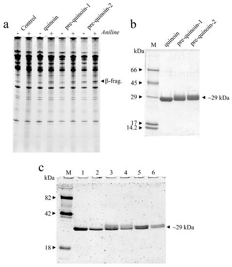 In this framework, to obtain a more homogeneous preparation of these novel RIPs, a further purification step by FPLC was carried out for both pools. The Source-S re-chromatography profiles showed the presence of a main principal protein peak, hereafter named pre-quinoin-1 and pre-quinoin-2 (Figure S1b,c). The SDS-PAGE analysis showed that the fractions of pre-quinoin-1 and pre-quinoin-2 contained a single protein band, with a mobility for both corresponding to ~30-kDa (data not shown), for which these protein fractions contained two novel type 1 RIPs. Therefore, the fractions corresponding to pre-quinoin-1 and pre-quinoin-2 were pooled, dialyzed against water and used for further experiments considering their homogeneity shown by the SDS-PAGE analysis (Figure 1b). The yield of the purified proteins pre-quinoin-1 and pre-quinoin-2 was ~0.11 mg/100 g and ~0.85 mg/100 g of seeds, respectively.